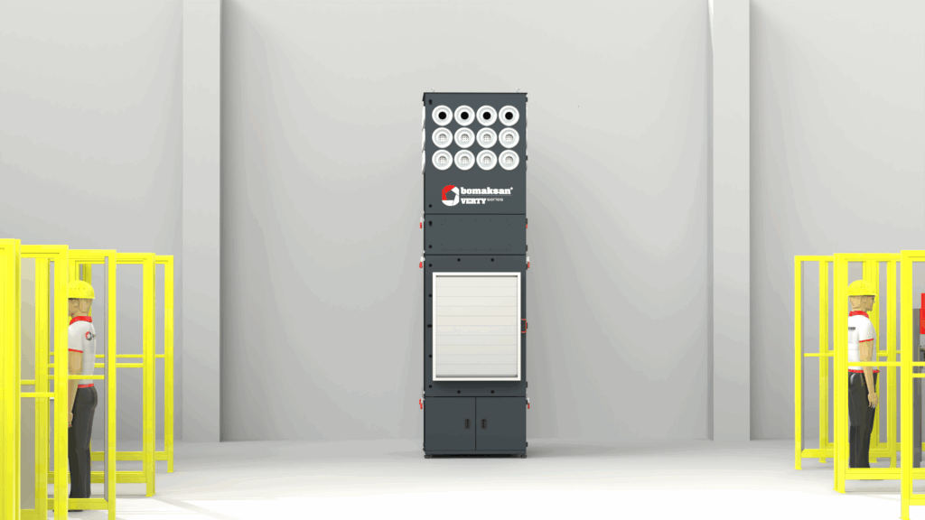 Bomaksan VERTY serisi, endüstriyel ortamlarda yüksek verimli toz ve duman emişi sağlamak üzere geliştirilmiş kompakt ve akıllı bir toz toplama ve filtrasyon sistemidir.